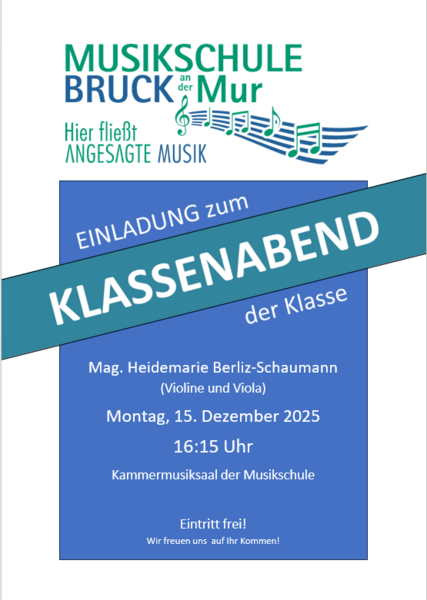 Sie sind hier: Aktuelles Klassenabend der Klassen Dr. Emilia Molnar, Mag. Gabriele Vollmer Weiterlesen Großes Weihnachtskonzert Gesamtleitung: MMag Andreas Farnleitner Weiterlesen Klassenabend der Klasse Mag. Heidemarie Berliz-Schaumann Weiterlesen Klassenabend der Klasse Mag. Jörg Haberl und Alessandra Reiner, BA MA MA Weiterlesen 3. Orchester-Konzert Weihnachtsoratorium Johann Sebastian Bach Weiterlesen Klassenabend der Klasse Klement Feichtenhofer Weiterlesen Serenadenkonzerte Mag. Sigrid Rennert Weiterlesen Klassenabend der Klasse Mag. Alexia Pernusch Weiterlesen Klassenabend extern Jazz Ensemble der Musikschule Bruck Weiterlesen Schlusskonzert SolistInnen und Ensembles der Musikschule Weiterlesen Klassenabend der Klasse Mag. Gabriele Vollmer Weiterlesen Klassenabend der Klasse Martin Temmel, MA Weiterlesen Klassenabend der Klasse Marigona Komani Weiterlesen Sommerkonzert Solist*innen und Ensembles der Musikschule Weiterlesen Klassenabend der Klasse Cagatay Ata, Bsc BA BA Weiterlesen Vocal Night der Klassen Lena Mentschel, MA; Johanna Seitinger, BA BA BA Weiterlesen Klassenabend der Klasse Michael Fabjancic-Lagger, BA BA MA MA Weiterlesen Tag der offenen Tür Weiterlesen Klassenabend der Klasse Mag. Irmgard Schnedl Weiterlesen 2. Orchester-Konzert: Young Artists Vol.2 Weiterlesen Liederabend_Klasse für Gesang Mag. Sigrid Rennert Weiterlesen Klassenabend der Klasse Lukas Raumberger, BA Weiterlesen Klassenabend der Klasse Mag. Heidemarie Berliz- Schaumann Weiterlesen Klassenabend der Klassen Mag. Gerlinde Lenger und Nicole Urdl, BA MA Weiterlesen Klassenabend der Klasse Klement Feichtenhofer Weiterlesen Klassenabend der Klasse Dr. Emilia Molnar Weiterlesen Klassenabend der Klasse Manuel Schuster Weiterlesen Klassenabend der Klassen Mag. Jörg Haberl, Alessandra Reiner BA, MA Weiterlesen Klassenabend der Klasse Mag. Ulrike Beermann Weiterlesen Klassenabend der Klasse MMag. Andreas Fahrnleitner Weiterlesen Young Styrian String Orchestra Serenadenkonzert Weiterlesen Klassenabend der Klasse Mag. Gabriele Vollmer Weiterlesen Konzert unserer erwachsenen Schüler: innen Weiterlesen 1. Orchester-Konzert: Happy birthday, Johann Strauss! Weiterlesen Klassenabend der Klasse Mag. Oliver Holzer-Gilg Horn Weiterlesen Große Faschingsparty in der Musikschule Fr. 28.Februar 2025 15:00 Musikschule Musikalische Schnitzeljagd Zauberer Gabriel Weiterlesen Soundscapes Von "Pop bis Hip-Hop" Das Jazz- Orchester der Musikschule unter der Leitung von Michael Fabjancic-Lagger Weiterlesen Klassenabend der Klasse Rene Führpaß Trompete, Tenorhorn Weiterlesen Kuscheltierkonzert Folge 3: Die Holzblasinstrumente Ein Mitmachkonzert für Kinder und ihre liebsten Kuscheltiere! (ab 4 Jahren) FR. 7. Februar 2025 16:00 Uhr … Weiterlesen Klassenabend der Klasse Klement Feichtenhofer Freitag 24. Jänner 2025 16:00 Kammermusiksaal der Musikschule Steirische Harmonika, Hackbrett Weiterlesen Klassenabend der Klasse Mag. Irmgard Schnedl Donnerstag 23.Jänner 2025 17:30 Kammermusiksaal der Musikschule Klavier Weiterlesen Klassenabend der Klasse Mag. Gerlinde Lenger Klarinette, Saxophon, Keyboard, Steirische Harmonika Weiterlesen Großes Weihnachtskonzert Schüler*innen der Gesangsklassen Sigrid Rennert und Anna-Lena Mentschel Josef Haydn Orchester Weiterlesen Klassenabend der Klasse Sophie Stocker BA Violoncello Weiterlesen Klassenabend der Klasse Klement Feichtenhofer Steirische Harmonika, Hackbrett, Gitarre... Weiterlesen Die Schöpfung 3. Orchester-Konzert der Musikschule mit dem Joseph-Haydn Orchester, Dirigent: Herbert Handl Solisten: Jutta Hochörtler, Sopran Lars Tappert,… Weiterlesen Liederabend Samstag 12.10.2024 18:30 Kammermusiksaal der Musikschule Magdalena Hirzberger Sopran Stefanie Schöberl Mezzosopran Simon Schuller Klavier … Weiterlesen Willkommen im neuen Schuljahr! Neuanmeldungen für das Schuljahr 2024/25 sind noch möglich! Kostenlose Schnupperstunden können jederzeit vereinbart werden. Wir freuen uns auf Dein… Weiterlesen Sommerkonzert der Musikschule Unsere Solist: innen und Ensembles musizieren für Sie! Freitag, 28.Juni 2024 17:00 Stadtsaal Bruck/Mur Weiterlesen Schlusskonzert Pernegg Solist:innen und Ensembles zeigen Ihr Können Weiterlesen Serenadenkonzerte 2024 Liebe, du Himmel auf Erden Eine Produktion der Gesangsklasse Sigrid Rennert Kammerorchester der Musikschule Bruck/Mur Dirigent: Thomas Platzgummer Weiterlesen Klassenabend der Klasse Mag. Gabriele Vollmer Violine, Klavier Weiterlesen Klassenabend der Klasse Lukas Raumberger, BA Bass, Gitarre Weiterlesen Klassenabend der Klasse Mag. Heidemarie Berliz Violine, Viola Weiterlesen Klassenabend der Klassen Mag. Angelika Piccolotto, Mag. Sylvia Hollerer Querflöte, Klavier, Steirische Harmonika, Akkordeon, Keyboard Weiterlesen Klassenabend der Klasse Mag. Alexia Pernusch Klavier Weiterlesen Young Styrian String Orchestra Live in concert! Sonntag, 9. Juni 2024 17:00 Stadtsaal Bruck/Mur Weiterlesen Klassenabend der Klassen Mag Sylvia Hollerer und Mag Angelica Piccolotto Weiterlesen Konzert des Jazzensembles der Klasse Herwig Gradischnig Weiterlesen Abschlusskonzert Carina Haring Abschlusskonzert Violine 03.05.2024 18:00Uhr Kammermusiksaal der Musikschule Weiterlesen Josef Peyer Wettbewerb 2024 Florian Schmid (Klasse Klement Feichtenhofer) hat beim 13. Josef Payer Preis - Steirischer Volksmusikwettbewerb 2024 in der Wertungsklasse Solo B das… Weiterlesen Klassenabend Cagatay Ata BSc BA BA Gitarre Mittwoch 29.05.2024 18:00 Weiterlesen Klassenabend Mag Ulrike Beermann Freitag, 17.Mai 24 18:00 Kammermusiksaal der Musikschule Weiterlesen Tag der offenen Tür Alle Instrumente können ausprobiert und erforscht werden. Tolle Rätselralley mit süßen Preisen! Erkunde Deine Musikschule! Sei dabei! Verschiedene… Weiterlesen Hofkonzerte Musik in historischen Höfen Ensembles der Musikschule Bruck an der Mur und viele weitere Musiker:innen unterhalten Sie in historischen Höfen. … Weiterlesen Volksmusikabend der Musikschule Solist:innen und Ensem
